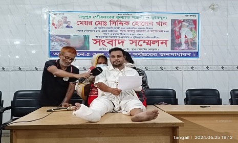 নিজস্ব প্রতিনিধিঃ টাঙ্গাইলের মধুপুর পৌরসভার সভার মেয়র সিদ্দিক হোসেন খানের বিরুদ্ধে কাউন্সিলর বাবলু আকন্দের উপর হামলার প্রতিবাদে সংবাদ সম্মেলন অনুষ্ঠিত হয়েছে। মঙ্গলবার (২৫ জুন) বিকেলে টাঙ্গাইল প্রেসক্লাবের বঙ্গবন্ধু অডিটরিয়ামে এ সংবাদ সম্মেলন করা হয়। এতে লিখিত বক্তব্য পাঠ করেন হামলার শিকার পৌরসভার বর্তমান ৫নং ওয়ার্ডের কাউন্সিলর বাবলু আকন্দ।