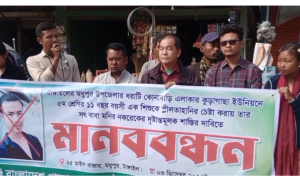 মধুপুরে ৫ম শ্রেণিতে পড়ুয়া মেয়েকে শ্লীলতাহানির চেষ্টা অভিযোগে সৎপিতার শাস্তির দাবিতে মানববন্ধন