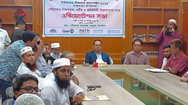 মধুপুর উপজেলা নির্বাহী অফিসার ও পৌর প্রশাসক মো জুবায়ের হোসেন এর সভাপতিত্বে, টাইফয়েড টিকাদান ক্যাম্পেইন ২০২৫ বাস্তবায়ন উপলক্ষে উপজেলার শিক্ষকবৃন্দ, ধর্মীয় ও কমিউনিটি লিডারগনের সাথে ওরিয়েন্টেশন সভা অনুষ্ঠিত হয়েছে। বুধবার