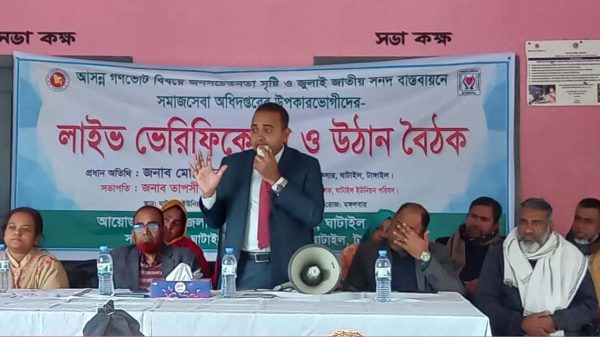 আসন্ন ক্রয়োদশ জাতীয় সংসদ নির্বাচনে গণভোট বিষয়ে জনসচেতনতা সৃষ্টি ও জুলাই জাতীয় সনদ বাস্তবায়নে সমাজসেবা অধিদপ্তরের উপকারভোগীদের লাইভ ভেরিফিকেশন ও উঠান বৈঠক অনুষ্ঠিত। ৬ জানুয়ারী (মঙ্গলবার) উপজেলার ২নং ঘাটাইল সদর