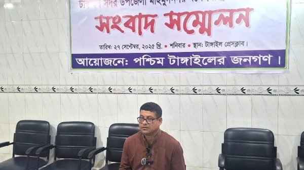টাঙ্গাইল সদর উপজেলার মাহমুদনগর ইউনিয়নে ধলেশ্বরী নদীতে ব্রিজ নির্মাণের দাবিতে সংবাদ সম্মেলন অনুষ্ঠিত হয়েছে। শনিবার (২৭ সেপ্টেম্বর) দুপুরে টাঙ্গাইল প্রেসক্লাবে স্থানীয় বাসিন্দা জাহাঙ্গীর আলম এ সংবাদ সম্মেলন করেন। লিখিত বক্তব্য