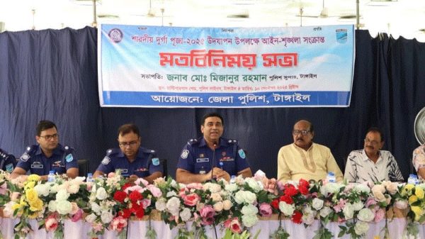 টাঙ্গাইলে যথাযোগ্য মর্যাদায় শারদীয় দুর্গাপূর্জা উদযাপন উপলক্ষে বিভিন্ন উপজেলার পূজা উদযাপন কমিটির নেতৃবৃন্দের সাথে মতবিনিময় সভা করেছে পুলিশ। বুধবার দুপুরে পুলিশ লাইনসের ড্রিল শেডে এ সভার আয়োজন করা হয়। টাঙ্গাইলের