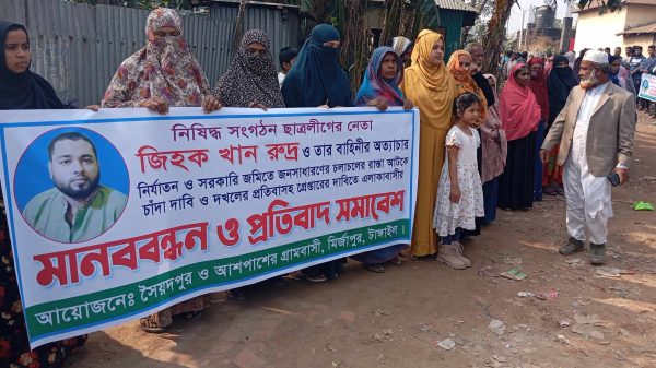 মির্জাপুর (টাঙ্গাইল) প্রতিনিধিঃ টাঙ্গাইলের মির্জাপুরে সরকারি রাস্তায় বাঁশের বেড়া দিয়ে জনসাধারণের চলাচলে প্রতিবন্ধকতা সৃষ্টির প্রতিবাদে মানববন্ধন ও বিক্ষোভ সমাবেশ করেছে এলাকাবাসী। রোববার উপজেলার গোড়াই-সখীপুর সড়কের গোড়াই মঈননগর এলাকায় সৈয়দপুরসহ আশপাশের